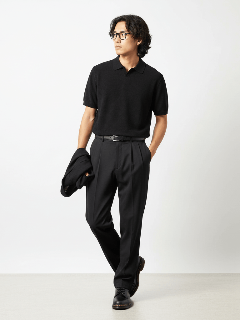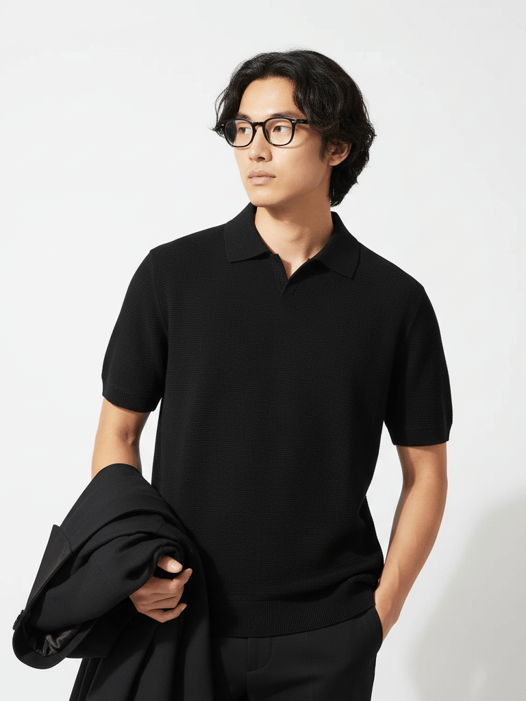 Pakaian model Polo tanpa kancing dengan tekstur pada kainnya terlihat classy. Sangat cocok dipakai buat santai untuk kamu yang suka dengan tampilan clean dan maskulin.