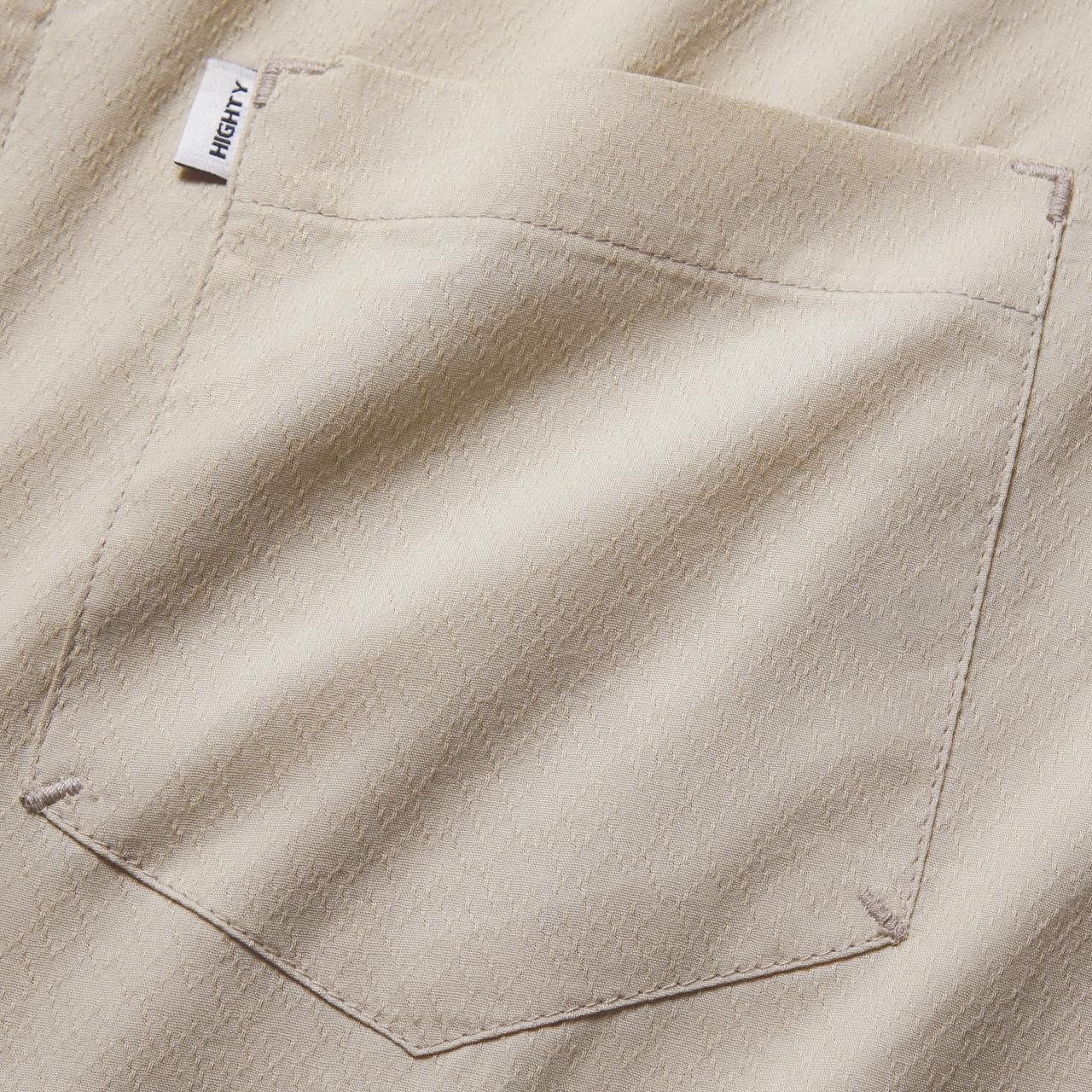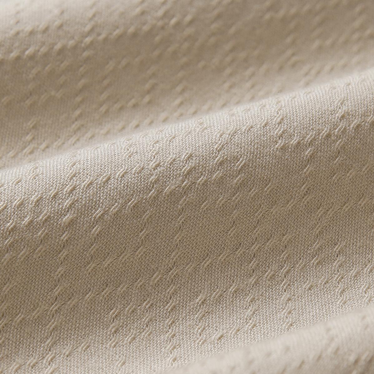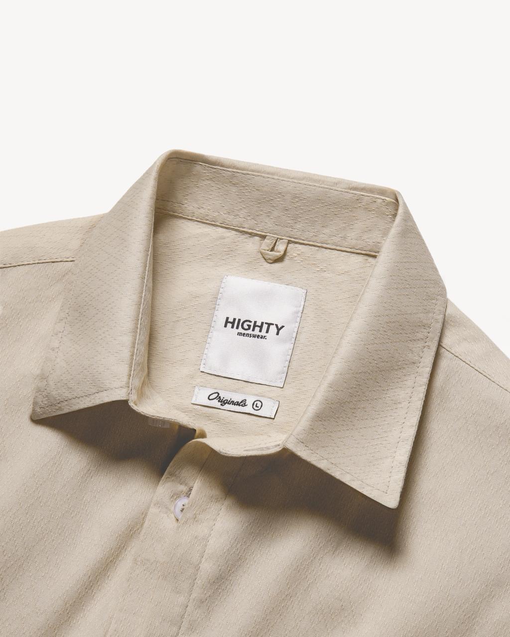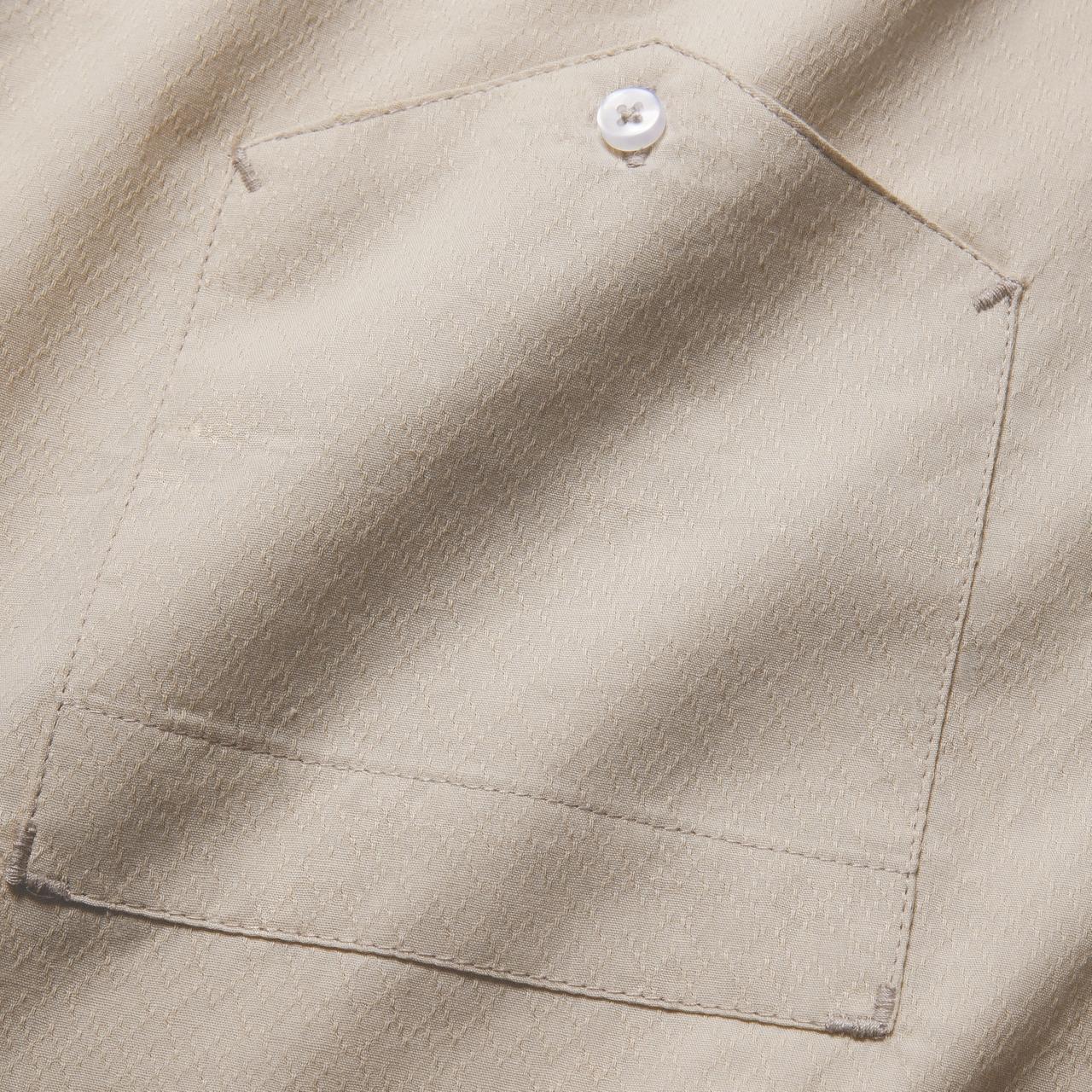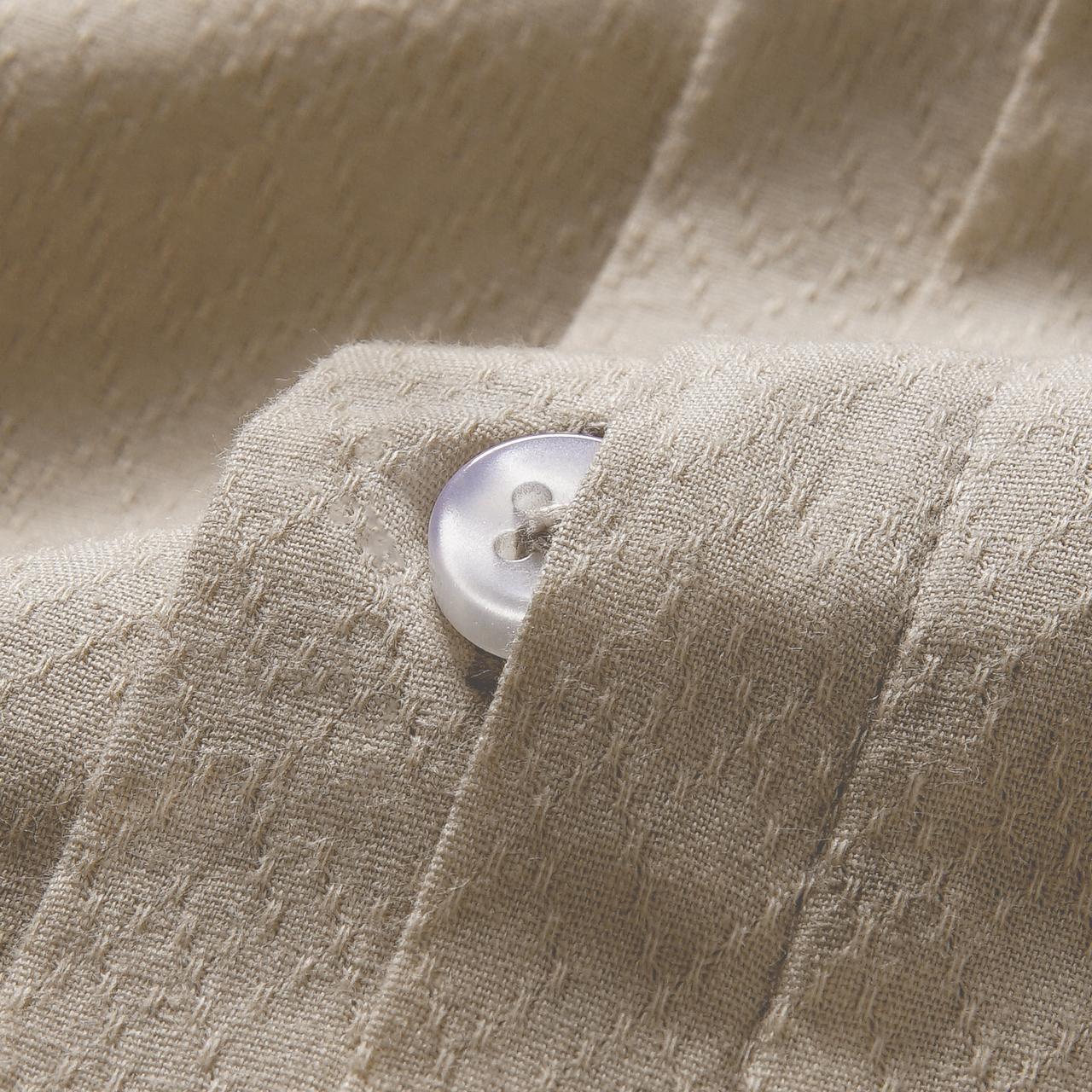 Kemeja ini terbuat dari kain katun dengan permukaan bertekstur. Ketebalan bahannya standar kemeja pada umumnya serta breathable.